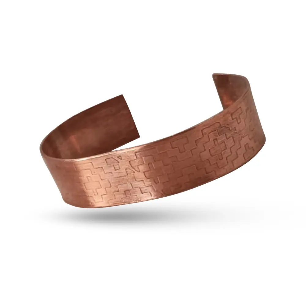 Pulsera de cobre con diseño abierto, adornada con detalles trenzados a lo largo de su estructura. En el centro, presenta dos corazones entrelazados, agregando un toque de romanticismo y elegancia. Perfecta para quienes buscan un accesorio artesanal y con estilo único.